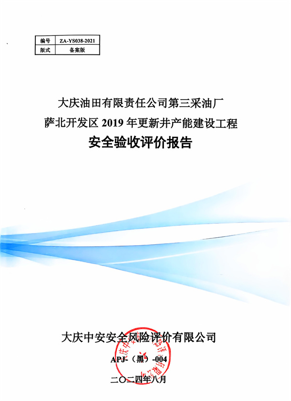 大慶油田有限責(zé)任公司第三采油廠薩北開發(fā)區(qū)2019年更新井產(chǎn)能建設(shè)工程安全驗(yàn)收評(píng)價(jià)報(bào)告
