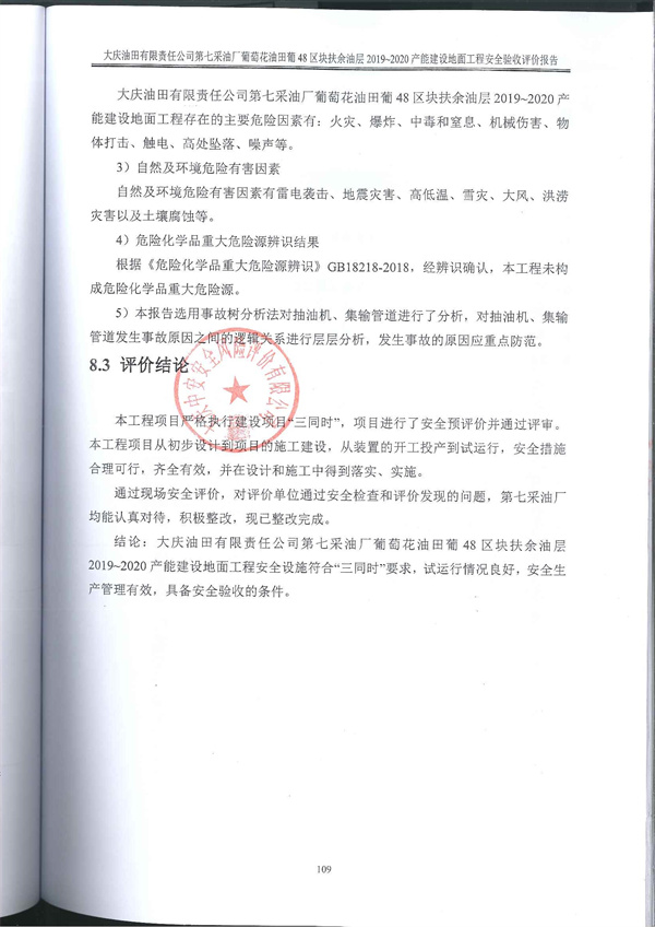 大慶油田有限責(zé)任公司第七采油廠葡萄花油田葡48區(qū)塊扶余油層2019~2020產(chǎn)能建設(shè)地面工程安全設(shè)施符合“三同時(shí)”要求,試運(yùn)行情況良好,安全生產(chǎn)管理有效,具備安全驗(yàn)收的條件 |