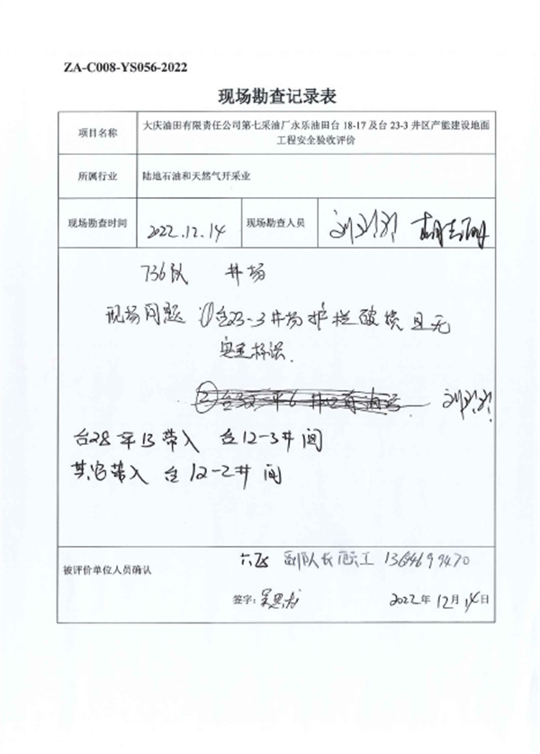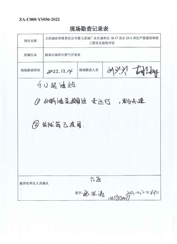 大慶油田有限責(zé)任公司第七采油廠永樂油田臺18-17及臺23-3井區(qū)產(chǎn)能建設(shè)地面工程設(shè)計、施工、試運行管理和監(jiān)督制度齊全,安全設(shè)施、設(shè)備、裝置與主體工程同時設(shè)計、同時施工、同時投入生產(chǎn)和使用,試運行情況良好,安全生產(chǎn)管理有效,具備安全驗收條件。 |