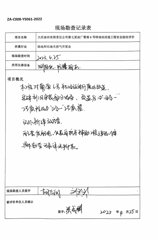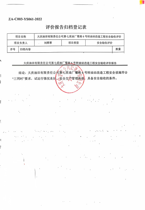 大慶油田有限責任公司第七采油廠葡南6號轉(zhuǎn)油站改造工程安全驗收評價報告