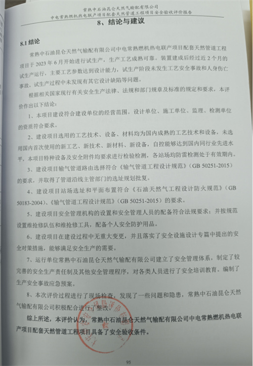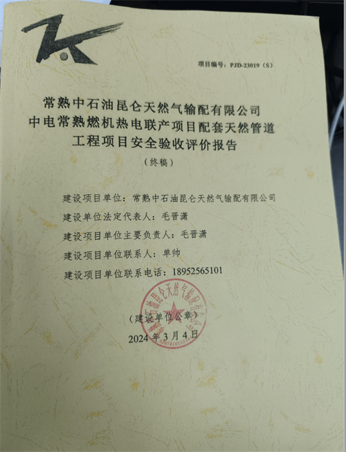 常熟中石油昆侖天然氣輸配有限公司中電常熟燃機(jī)熱電聯(lián)產(chǎn)項(xiàng)目配套天然管道工程項(xiàng)目安全設(shè)施竣工驗(yàn)收評(píng)價(jià)報(bào)告 |
