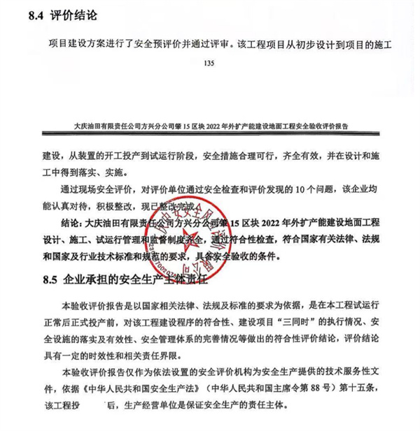 大慶油田有限責(zé)任公司方興分公司肇15區(qū)塊2022年外擴(kuò)產(chǎn)能建設(shè)地面工程設(shè)計(jì)、施工、試運(yùn)行管理和監(jiān)督制度齊全,通過符合性檢查,符合國(guó)家有關(guān)法律、法規(guī)和國(guó)家及行業(yè)技術(shù)標(biāo)準(zhǔn)和規(guī)范的要求,具備安全驗(yàn)收的條件。