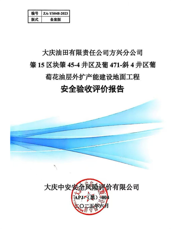 大慶油田有限責(zé)任公司方興分公司肇15區(qū)塊肇45-4井區(qū)及葡471-斜4井區(qū)葡萄花油層外擴(kuò)產(chǎn)能建設(shè)地面工程安全驗(yàn)收評價(jià) |