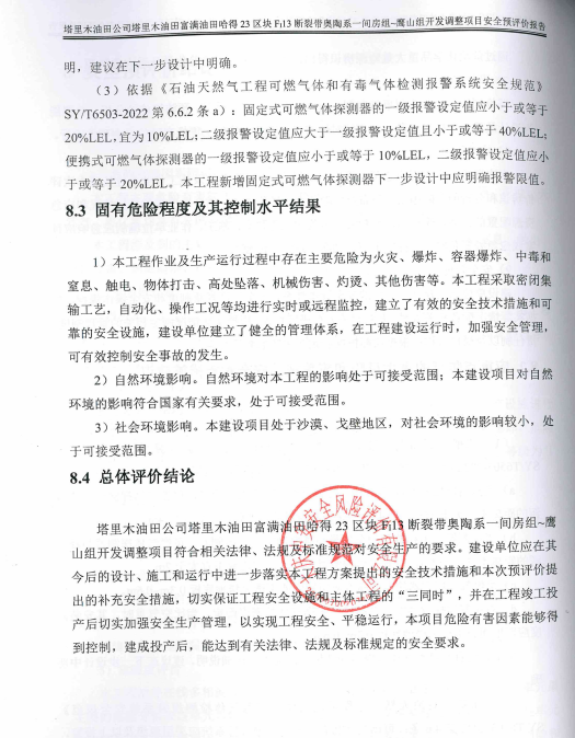 塔里木油田公司塔里木油田富滿油田哈得23區(qū)塊FI13斷裂帶奧陶系一間房組~鷹山組開發(fā)調(diào)整項(xiàng)目安全預(yù)評(píng)價(jià)報(bào)告