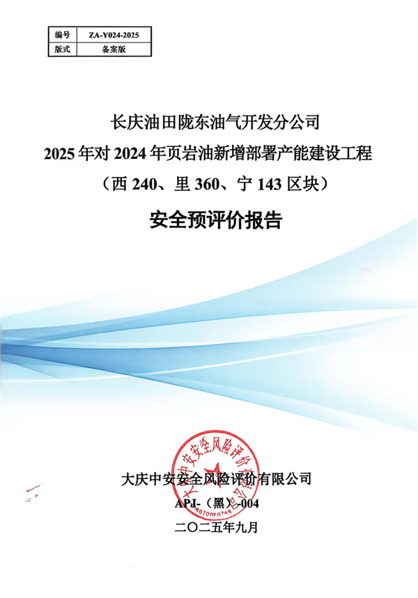 長慶油田隴東油氣開發(fā)分公司2025年對2024年頁巖油新增部署產(chǎn)能建設(shè)工程(西240、里360、寧143區(qū)塊)安全預(yù)評價報告