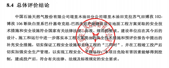中國石油天然氣股份有限公司塔里木油田分公司塔里木油田克拉蘇氣田博孜102-博孜106斷塊白堊系巴什基奇克組-巴西改組產(chǎn)能建設(shè)項目地面工程方案采取的安全技術(shù)措施和安全設(shè)施符合國家有關(guān)法律法規(guī)、標準、規(guī)范的要求。建設(shè)單位應(yīng)在其今后的設(shè)計、施工和運行中進一步落實本工程方案提出的安全技術(shù)措施和預(yù)評價報告中提出的補充安全措施,切實保證工程安全設(shè)施和主體工程的“三同時”,并在工程竣工投產(chǎn)后切實加強安全生產(chǎn)管理,以實現(xiàn)工程安全、平穩(wěn)運行,本項目危險有害因素能夠得到控制,建成投產(chǎn)后,符合有關(guān)法律、法規(guī)及標準規(guī)定的安全要求。 |