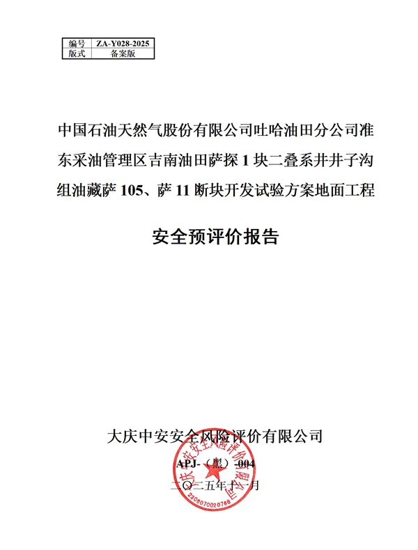 中國石油天然氣股份有限公司吐哈油田分公司準(zhǔn)東采油管理區(qū)吉南油田薩探1塊二疊系井井子溝組油藏薩105、薩11斷塊開發(fā)試驗方案地面工程安全預(yù)評價報告 |