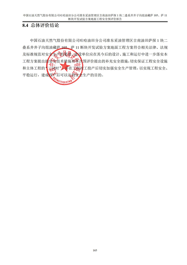 中國石油天然氣股份有限公司吐哈油田分公司準(zhǔn)東采油管理區(qū)吉南油田薩探1塊二疊系井井子溝組油藏薩105、薩11斷塊開發(fā)試驗方案地面工程方案符合相關(guān)法律、法規(guī)及標(biāo)準(zhǔn)規(guī)范對安全生產(chǎn)的要求。建設(shè)單位應(yīng)在其今后的設(shè)計、施工和運(yùn)行中進(jìn)一步落實本工程方案提出的安全技術(shù)措施和本次預(yù)評價提出的補(bǔ)充安全措施,切實保證工程安全設(shè)施和主體工程的“三同時”,并在工程竣工投產(chǎn)后切實加強(qiáng)安全生產(chǎn)管理,以實現(xiàn)工程安全、平穩(wěn)運(yùn)行,建成投產(chǎn)后可以達(dá)到安全生產(chǎn)的目的。 |
