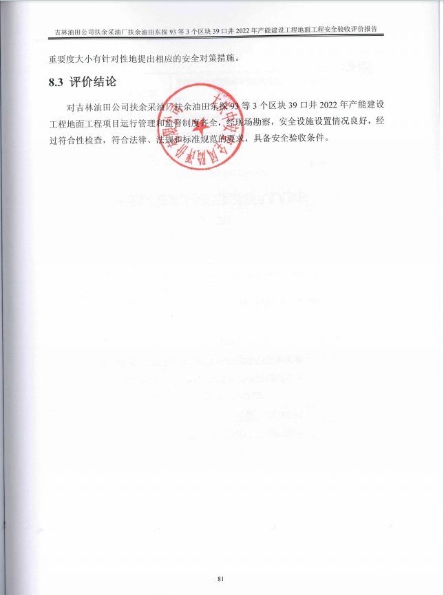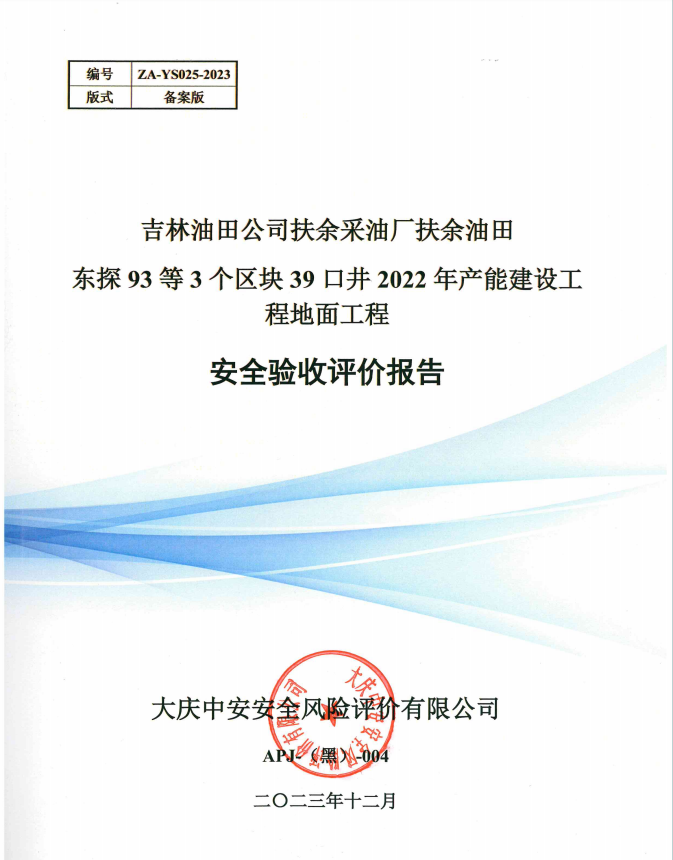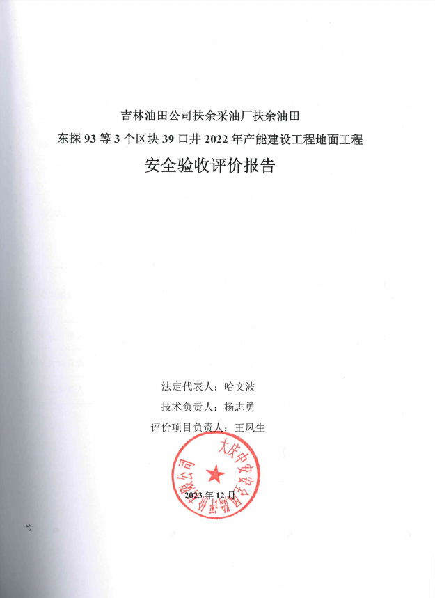 吉林油田公司扶余采油廠扶余油田東探93等3個區(qū)塊39口井2022年產(chǎn)能建設(shè)工程地面工程 安全驗收評價報告