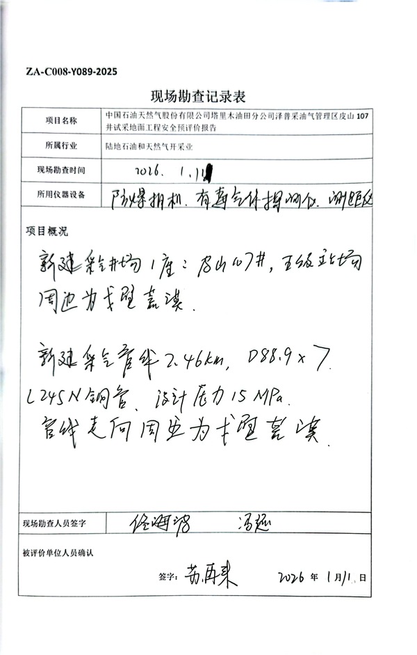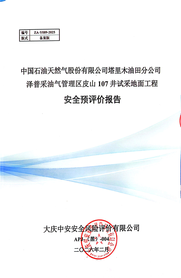 中國石油天然氣股份有限公司塔里木油田分公司澤普采油氣管理區(qū)皮山107井試采地面工程安全預(yù)評價(jià)