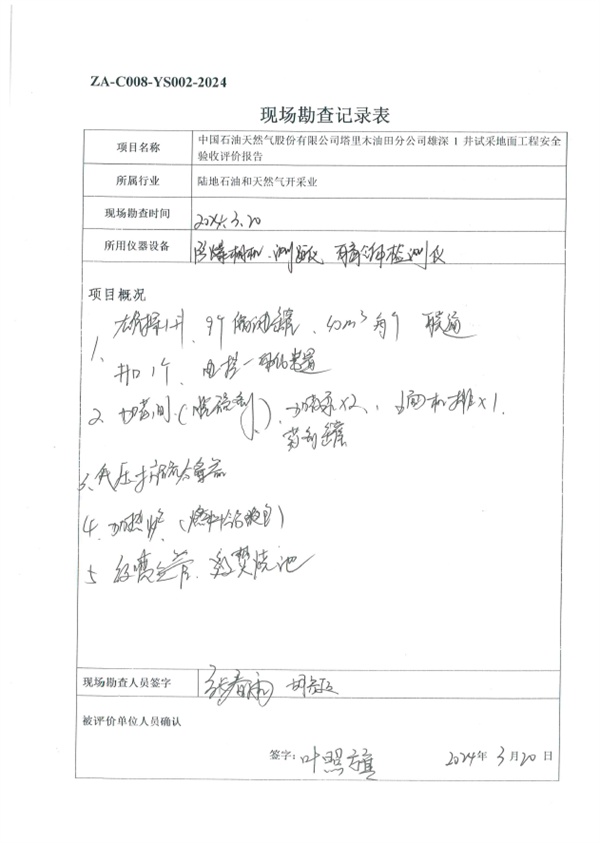 結(jié)論:中國石油天然氣股份有限公司塔里木油田分公司雄探1井試采地面工程安全設(shè)施符合“三同時”要求,試運(yùn)行情況良好,安全生產(chǎn)管理有效,具備安全驗收要求。