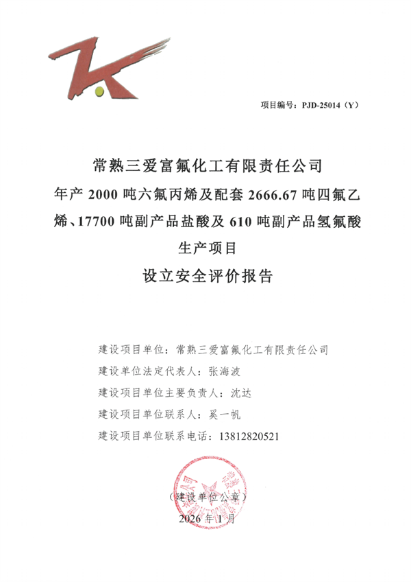 常熟三愛富氟化工有限責(zé)任公司年產(chǎn)2000噸六氟丙烯及配套2666.67噸四氟乙烯、17700噸副產(chǎn)品鹽酸及610噸副產(chǎn)品氫氟酸生產(chǎn)項(xiàng)目設(shè)立安全評價(jià)