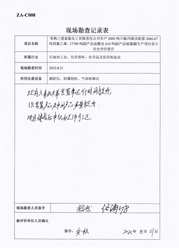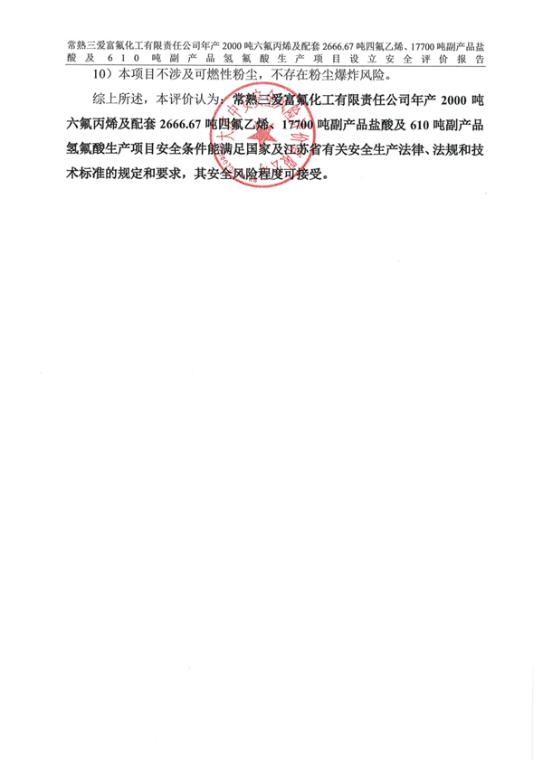 常熟三愛富氟化工有限責(zé)任公司年產(chǎn)2000噸六氟丙烯及配套2666.67噸四氟乙烯、17700噸副產(chǎn)品鹽酸及610噸副產(chǎn)品氫氟酸生產(chǎn)項(xiàng)目安全條件能滿足國家及江蘇省有關(guān)安全生產(chǎn)法律、法規(guī)和技術(shù)標(biāo)準(zhǔn)的規(guī)定和要求,其安全風(fēng)險(xiǎn)程度可接受。