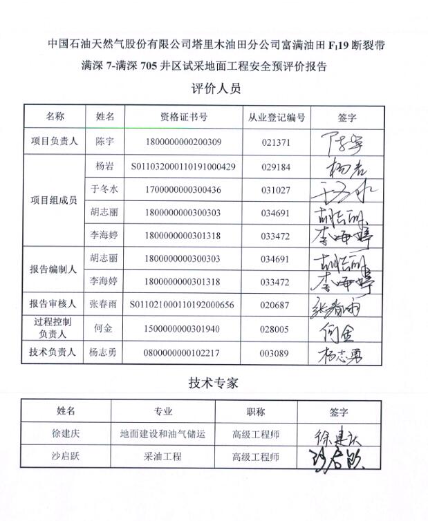 中國(guó)石油天然氣股份有限公司塔里木油田分公司富滿油田FI19斷裂帶滿深7-滿深705井區(qū)試采地面工程安全預(yù)評(píng)價(jià)