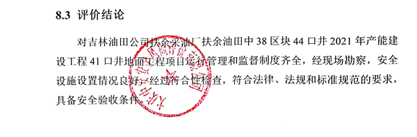 對(duì)吉林油田公司扶余采油廠扶余油田中38區(qū)塊44口井2021年產(chǎn)能建設(shè)工程41口井地面工程項(xiàng)目運(yùn)行管理和監(jiān)督制度齊全,經(jīng)現(xiàn)場(chǎng)勘察,安全設(shè)施設(shè)置情況良好,經(jīng)過符合性檢查,符合法律、法規(guī)和標(biāo)準(zhǔn)規(guī)范的要求,具備安全驗(yàn)收條件。 |