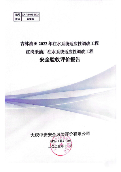 吉林油田2022年注水系統(tǒng)適應(yīng)性調(diào)改工程紅崗采油廠注水系統(tǒng)適應(yīng)性調(diào)改工程安全驗(yàn)收評價報告