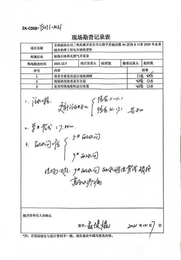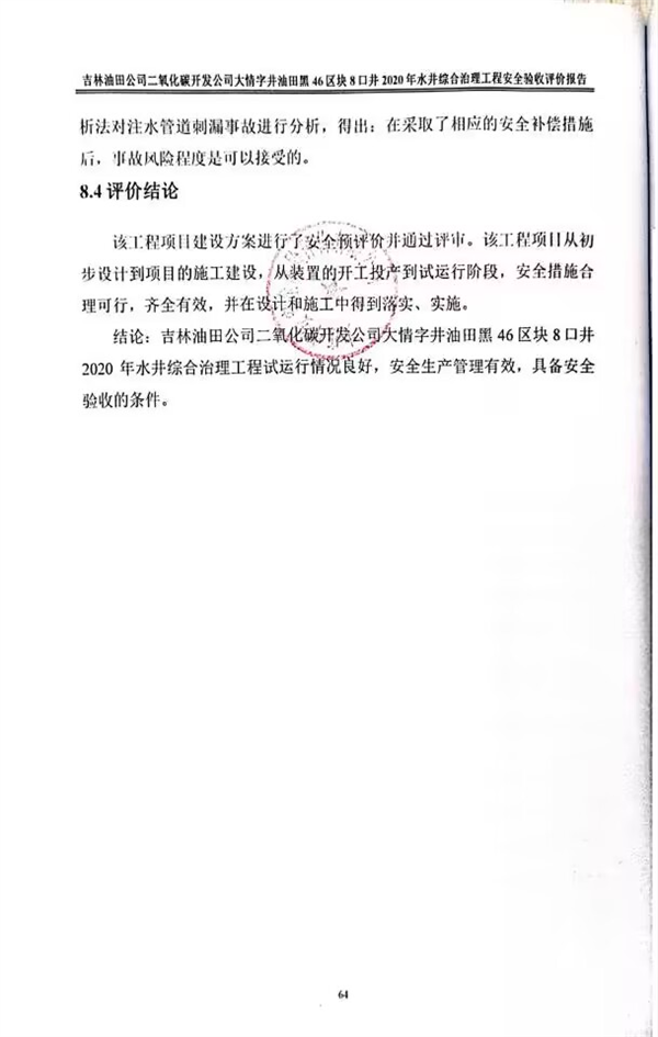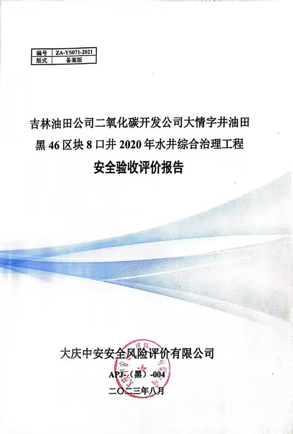 吉林油田公司二氧化碳開(kāi)發(fā)公司大情字井油田黑46區(qū)塊8口井2020年水井綜合治理工程 安全驗(yàn)收評(píng)價(jià)