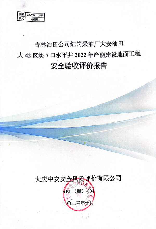 吉林油田公司紅崗采油廠大安油田大42區(qū)塊7口水平井2022年產(chǎn)能建設(shè)地面工程安全驗(yàn)收評價(jià)報(bào)告 |