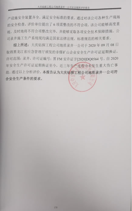 大慶鉆探工程公司地質錄井一公司于2020年09月08日取得黑龍江省應急管理廳頒發(fā)的非煤礦山企業(yè)安全生產(chǎn)許可證延期換證,許可范圍:錄井,許可證編號:黑FM安許證字[2020]DQ0564號。自2020年安全生產(chǎn)許可證延期換證至今,近三年生產(chǎn)過程中未發(fā)生重大傷亡事故。通過以上分析評價,本報告認為大慶鉆探工程公司地質錄井一公司符合安全生產(chǎn)條件的要求。 |