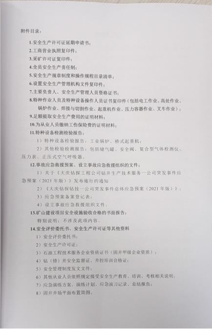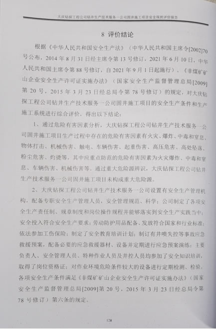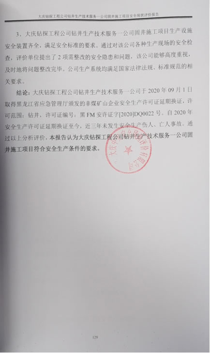 大慶鉆探工程公司鉆井生產(chǎn)技術(shù)服務(wù)一公司于2020年09月1日取得黑龍江省應(yīng)急管理廳頒發(fā)的非煤礦山企業(yè)安全生產(chǎn)許可證延期換證,許可范圍:鉆井,許可證編號:黑FM安許證字[2020]DQ0022號。自2020年安全生產(chǎn)許可證延期換證至今,近三年未發(fā)生安全生產(chǎn)傷人、亡人事故。通過以上分析評價(jià),本報(bào)告認(rèn)為大慶鉆探工程公司鉆井生產(chǎn)技術(shù)服務(wù)一公司固井施工項(xiàng)目符合安全生產(chǎn)條件的要求。 |