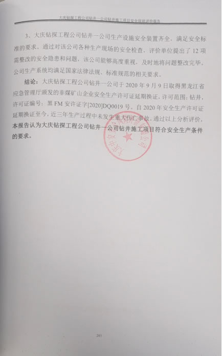 大慶鉆探工程公司鉆井二公司于2020年09月09日取得黑龍江省應急管理廳頒發(fā)的非煤礦山企業(yè)安全生產許可證延期換證,許可范圍:鉆井,許可證編號:黑FM安許證字[2020]DQ0020號。自2020年安全生產許可證延期換證至今,近三年生產過程中未發(fā)生重大傷亡事故。通過以上分析評價,本報告認為大慶鉆探工程公司鉆井二公司鉆井施工項目符合安全生產條件的要求。 |