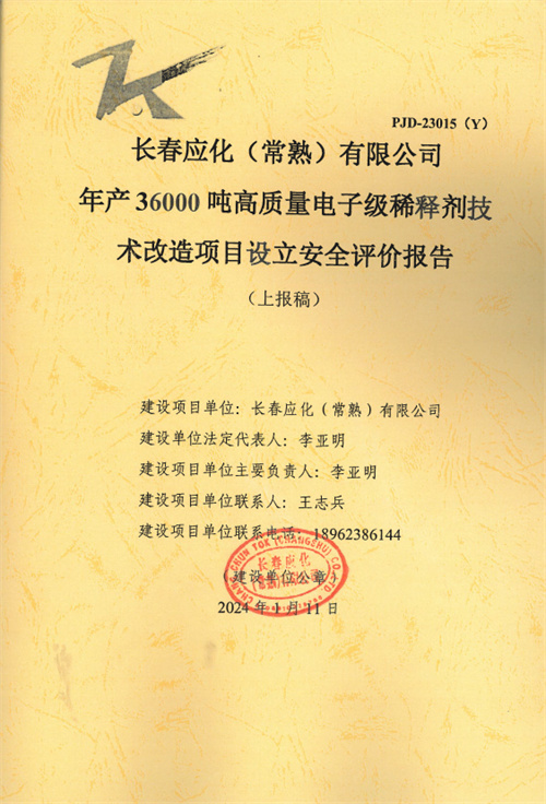 長春應(yīng)化(常熟)有限公司年產(chǎn)36000噸高質(zhì)量電子級稀釋劑技術(shù)改造項目設(shè)立安全評價報告