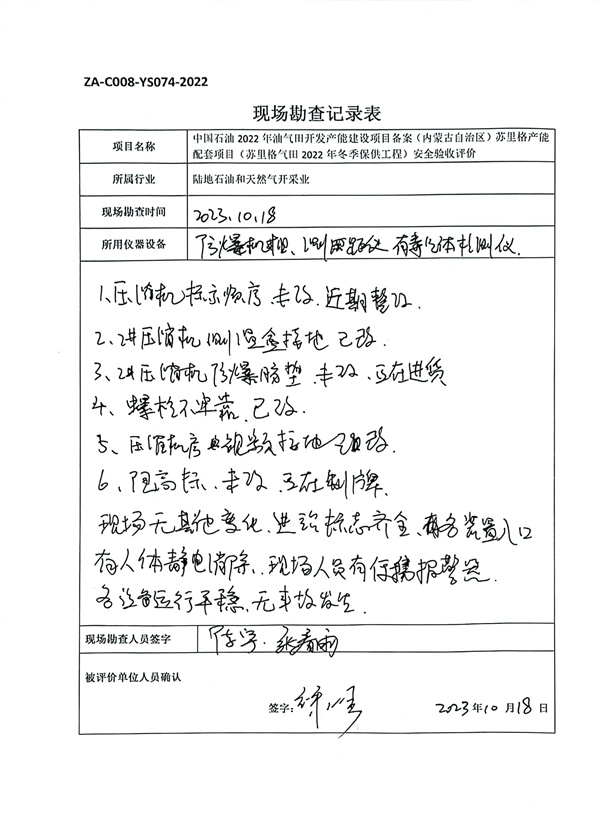 中國石油2022年油氣田開發(fā)產能建設項目備案(內蒙古自治區(qū))蘇里格產能配套項目(蘇里格氣田2022年冬季保供工程)安全設施設置和運行符合安全生產要求,試運行情況良好,安全生產管理有效,具備安全驗收的條件。 |