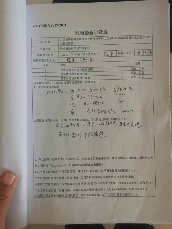 該工程嚴(yán)格執(zhí)行建設(shè)項(xiàng)目“三同時(shí)”,項(xiàng)目建設(shè)方案進(jìn)行了安全預(yù)評(píng)價(jià)并通過評(píng)審。該工程項(xiàng)目從初步設(shè)計(jì)到項(xiàng)目的施工建設(shè),從裝置的開工投產(chǎn)到試運(yùn)行階段,安全措施合理可行,齊全有效,并在設(shè)計(jì)和施工中得到落實(shí)、實(shí)施。 通過現(xiàn)場安全評(píng)價(jià),對(duì)評(píng)價(jià)單位通過安全檢查和評(píng)價(jià)發(fā)現(xiàn)的2個(gè)問題,天然氣分公司均能認(rèn)真對(duì)待,積極整改,現(xiàn)已整改完成。 結(jié)論:大慶油田有限責(zé)任公司天然氣分公司大慶油田薩南深冷裝置擴(kuò)建工程項(xiàng)目安全設(shè)施符合“三同時(shí)”要求,具備安全驗(yàn)收的條件。 |